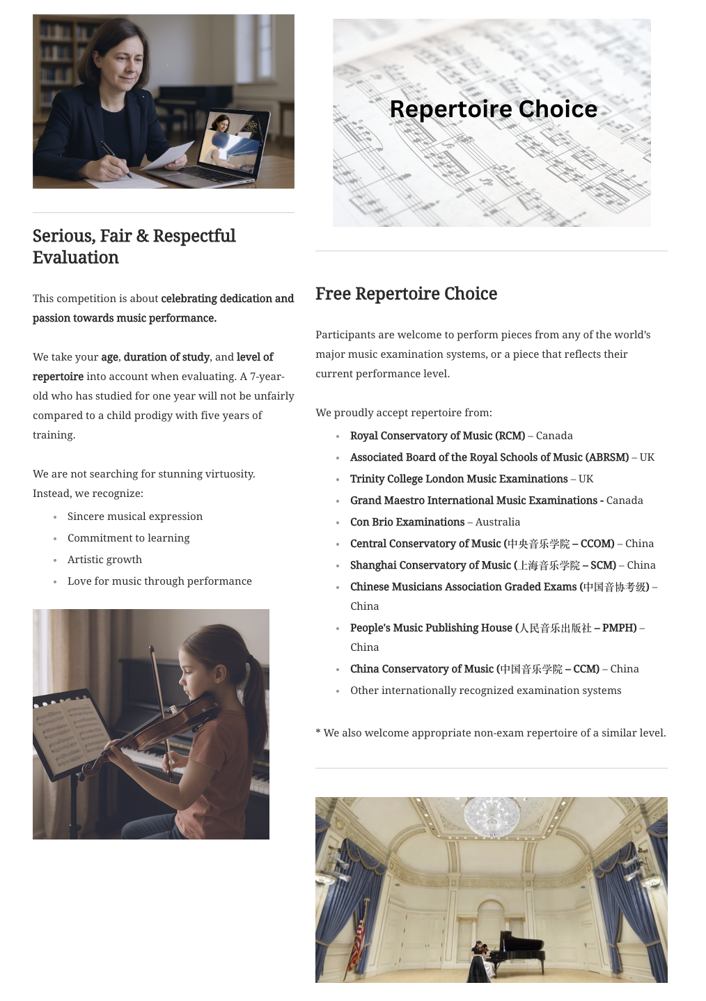 Repertoire is wide open: participants may choose from internationally recognized exam syllabi — from the Royal Conservatory of Music (Canada) and Associated Board of the Royal Schools of Music (UK), to Trinity College London exams and leading systems in China, Australia, and beyond — or submit non–exam pieces that reflect their current level.