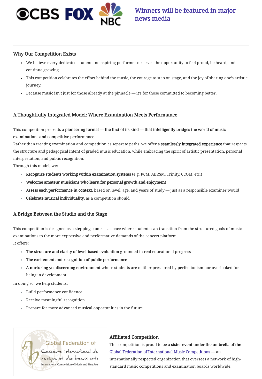Public recognition — winners will be featured in major news media, giving young and developing musicians a chance to be heard worldwide.